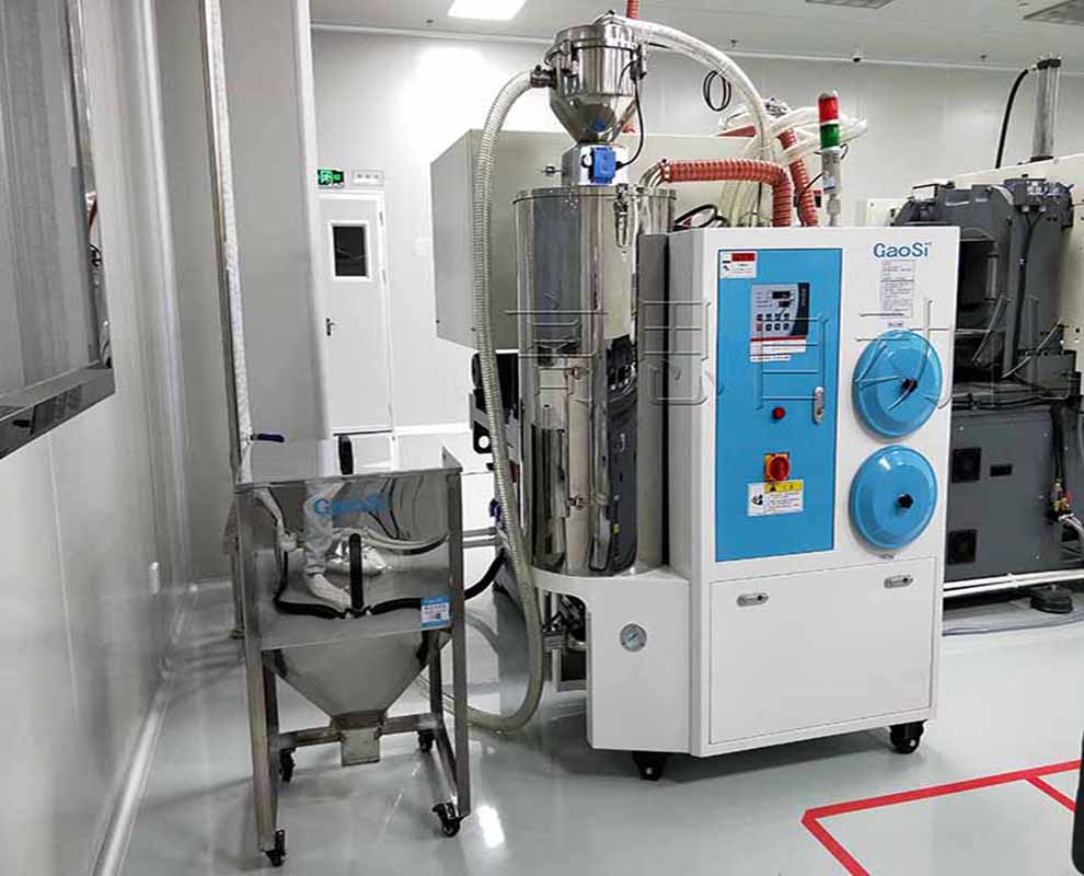 吸料部分:吸料是從儲料桶或其他儲料容器中吸入干燥料桶內(nèi),當(dāng)真空料斗的磁簧開關(guān)偵測到無料時,吸料馬達(dá)運轉(zhuǎn),使真空料斗內(nèi)產(chǎn)生真空,儲料桶中的原料由于空氣的壓力差被吸入真空料斗內(nèi),當(dāng)吸料時間完成后,吸料馬達(dá)停止運轉(zhuǎn),原料會因自重落入干燥桶內(nèi)。經(jīng)干燥后的原料從干燥料桶抽到安裝在塑膠成型機(jī)的電眼料斗內(nèi)或其他料斗內(nèi)。