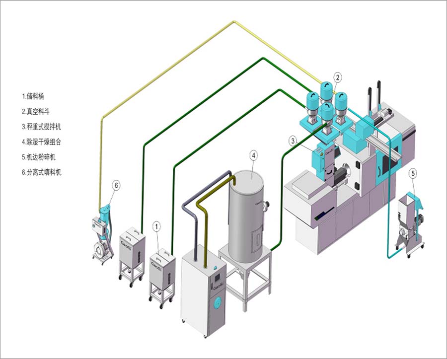 》具有回收料自動補償功能(回收料斗標配低料位開關(guān)),可根據(jù)回收料下料量的多少自動計算色差補償